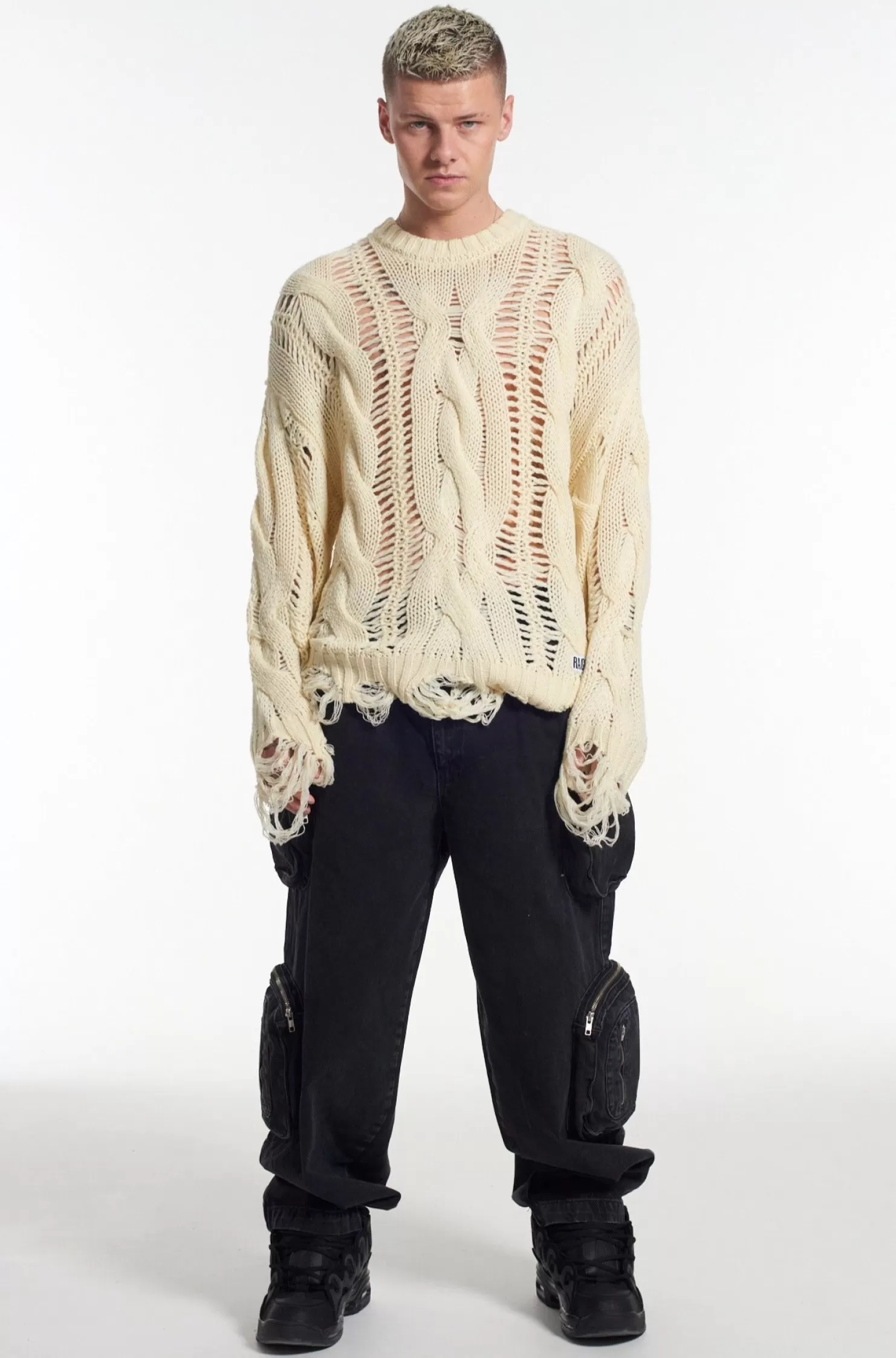 The Ragged Priest Ecru Open Cable Knit Jumper With Distressed Hem Detail.Baggy Fitladder Knit Panelsdistressed Hemselect…