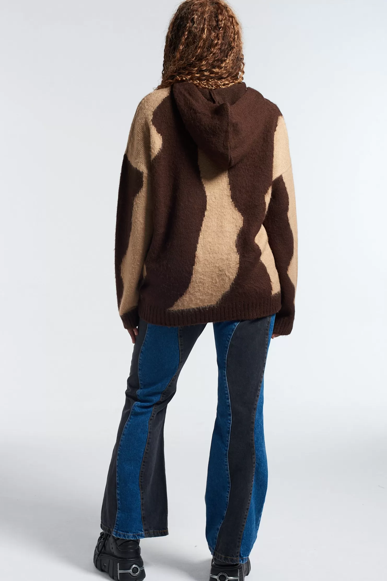The Ragged Priest Soft Knitted Beige And Brown Hoodie With Wavy Print Pattern, Hood And Central Embroidered Logo. Avai…