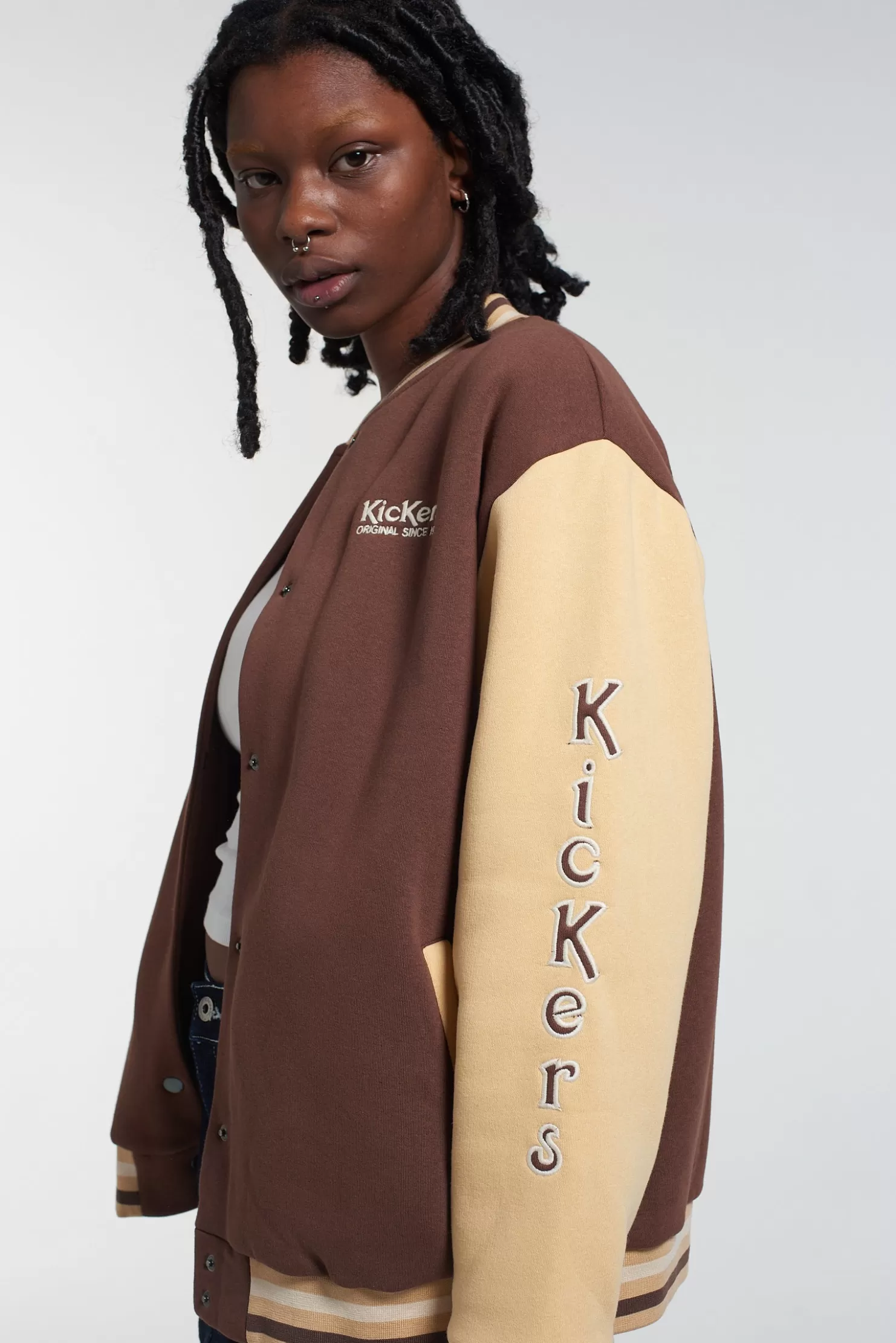 Kickers Classics Brown Varsity Jacket With Button Up Front And Front Pockets.⁃ Kickers Classics Branded Tab.⁃ Uk Sizes Xs, S, M, L &Amp; Xl.⁃ Model Is 5Ft 7” And Wears A Size Uk Small.