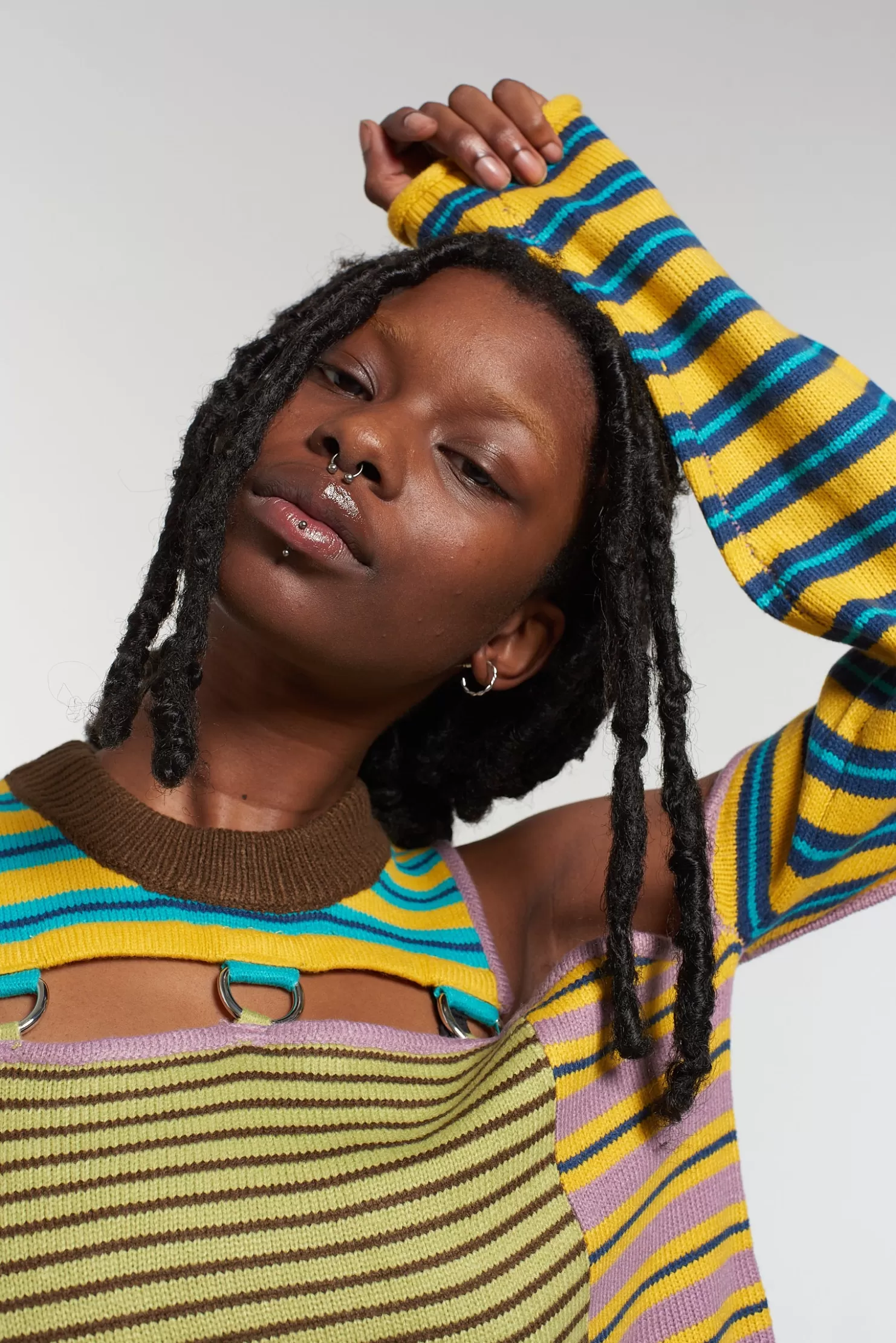 The Ragged Priest Striped Crop Top With Large Cold Shoulder, Cut Out Front Detail And Metal O Rings. Soft Light Weight Fabricmedium Stretchboxy Fitselect Your Normal Sizecrew Neckcontrast Colour Stripe Panellingcolours Include: Pink, Purple, Blue, Green, Brown, Yellow, Navy And Burgundywash According To Instructions On Care Label100% Acrylicmodel Wears A Size Small And Is 5’7 In Height.