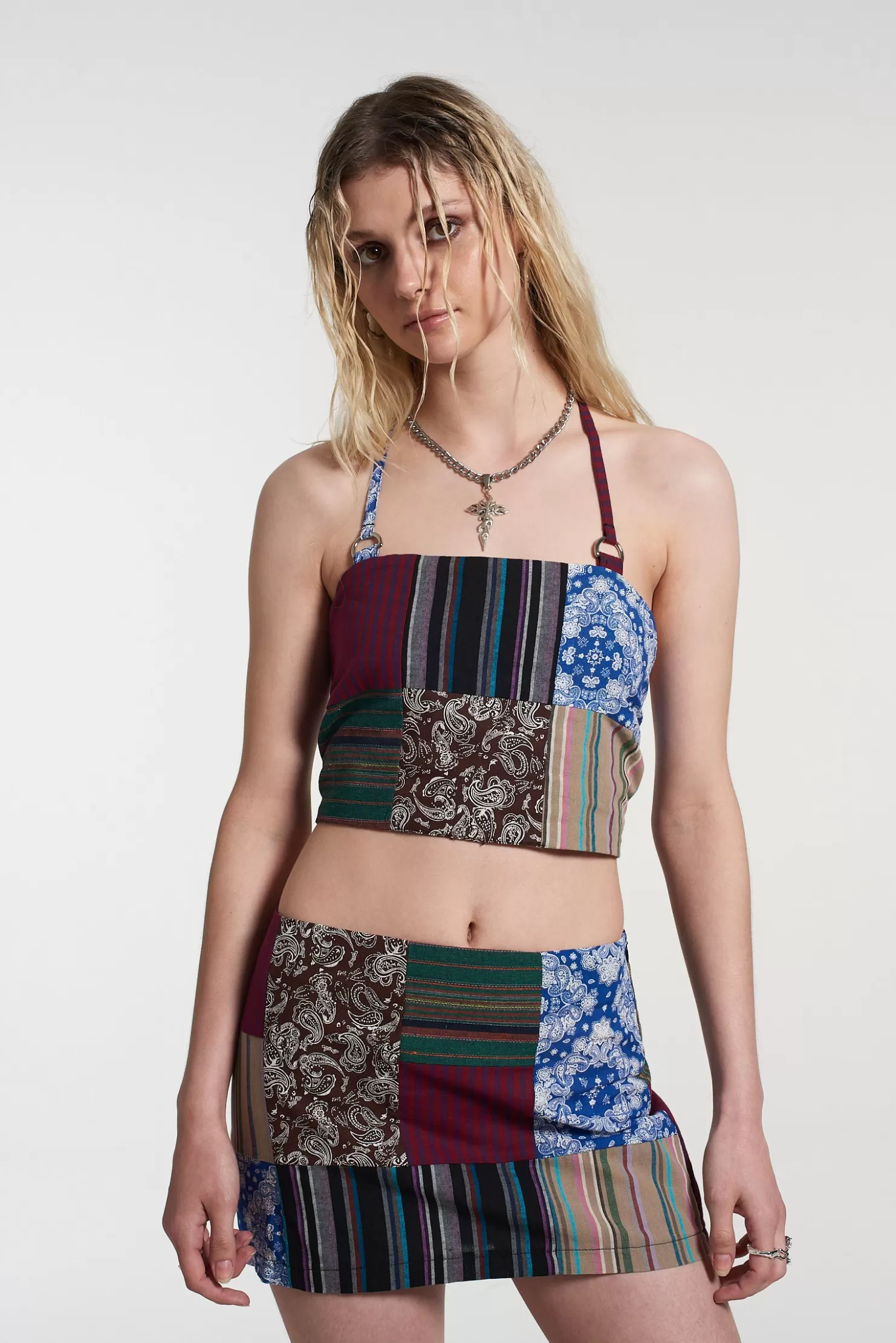 The Ragged Priest Mix Patchwork Printed Crop Top With D Ring Lace Up Back Detail And Adjustable Halter Neck. Light Wei…