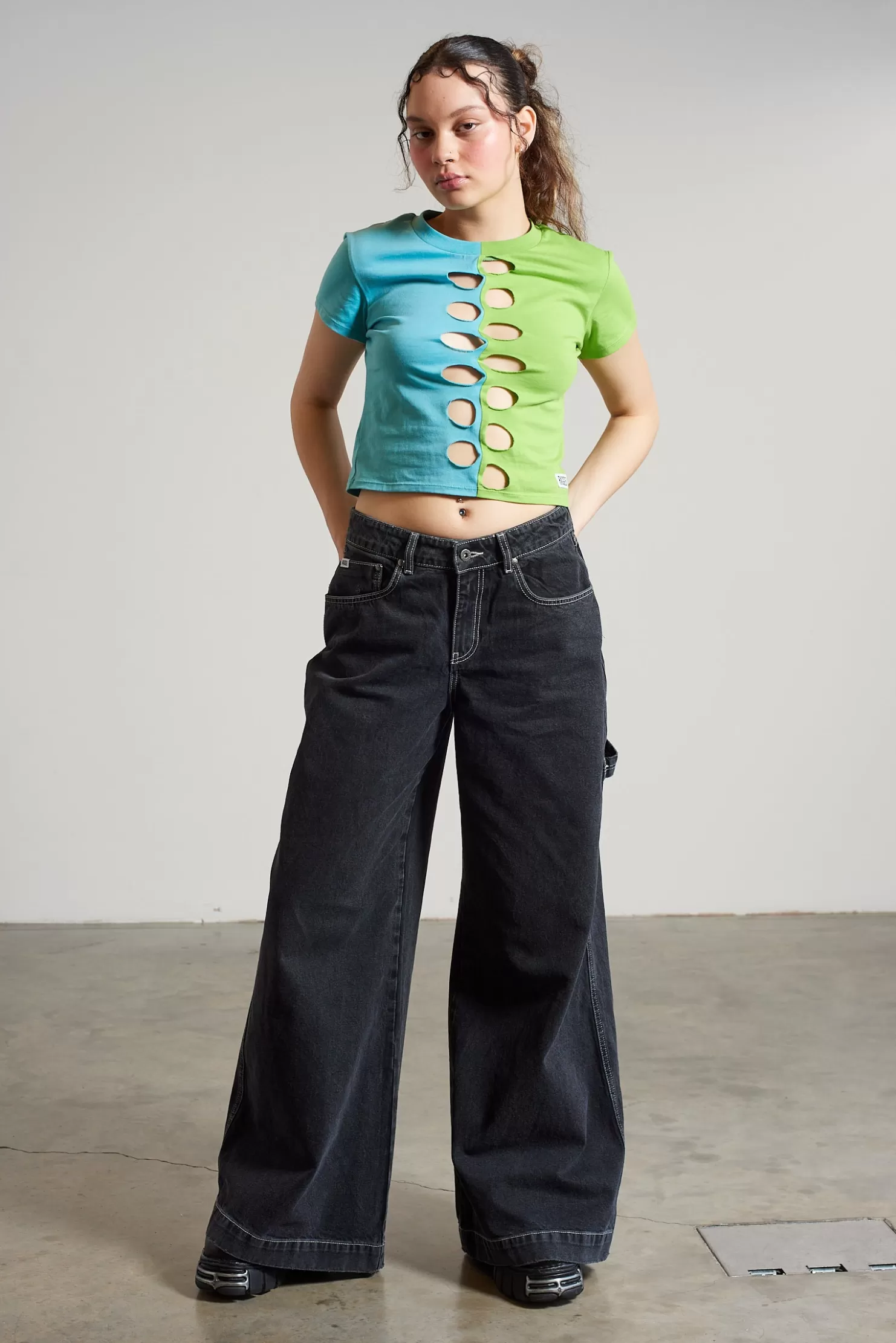 Ragged Jeans Green And Blue Half And Half Short Sleeve Tee With Cut Out Front Detail.100% Cotton.Available In Sizes Xs, S, M, L &Amp; Xl.Model Is 5’6 And Wears A Size S.