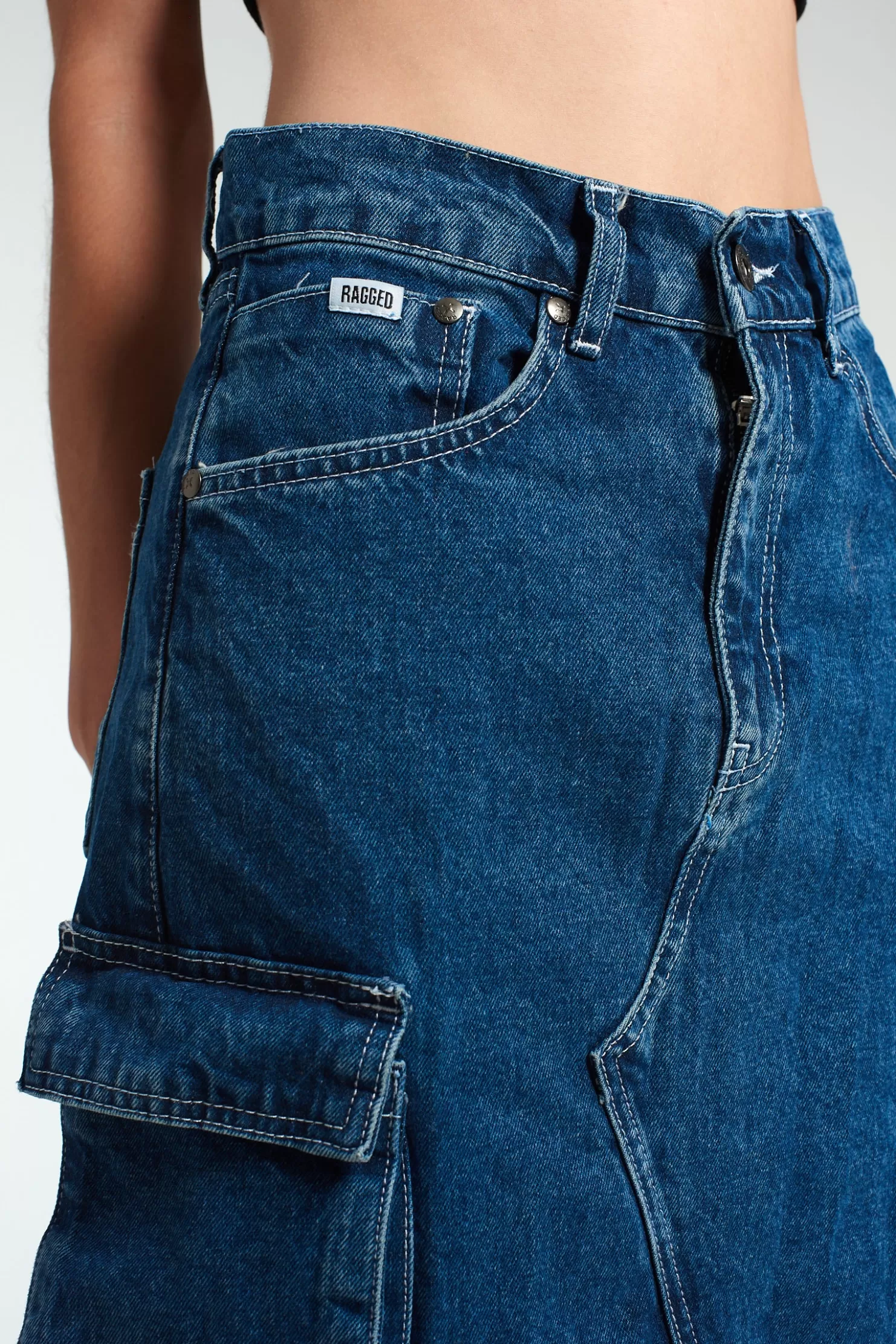 The Ragged Priest Blue Denim Midi Length Combat Skirt With Side Pockets And Front Split Detail. No Stretch Rigid Denimh…