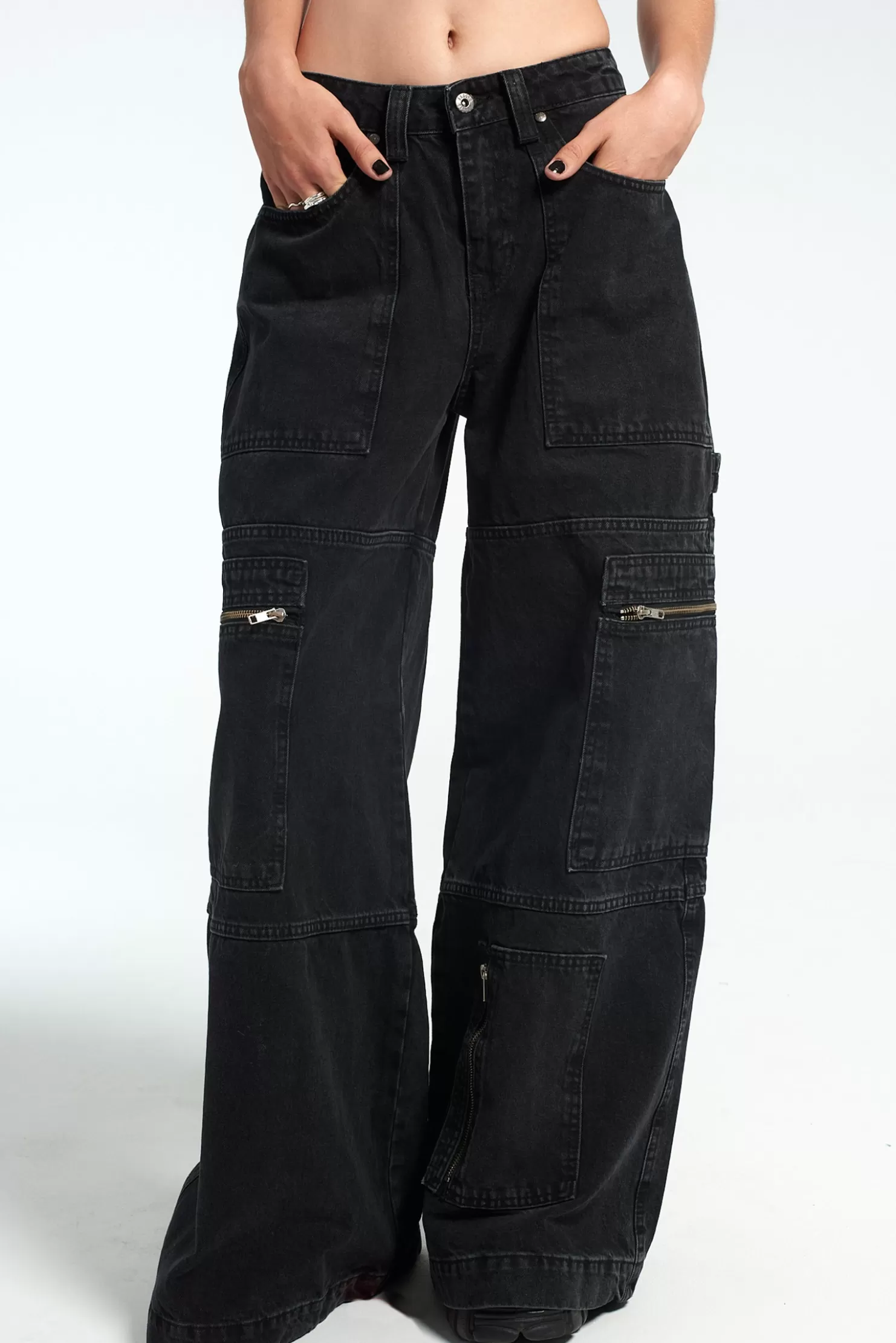 The Ragged Priest Signature Sweeper Jean Fit In Our Charcoal Wash Organic Denim With Combat Style Pockets With Silver…