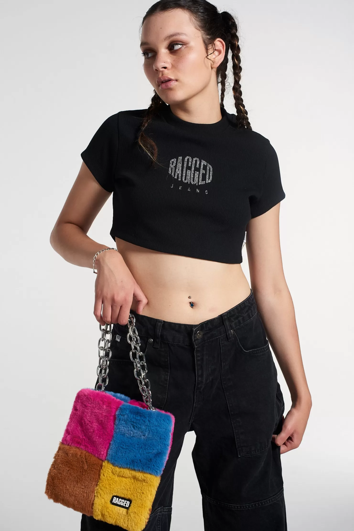 The Ragged Priest Faux Fur Checkerboard Pattern Grab Bag With Silver Chain Handles.Non Stretch Soft Fabricmagnetic Fasteningone Sizecolours Include: Pink, Blue, Brown And Yellowwhen Fastened Bag Measures 24Cm In Height (Excluding Straps)Wash According To Instructions On Care Labelsmall “Ragged” Rubber Tab On Frontouter: 100% Polyester Lining: 100% Polyester