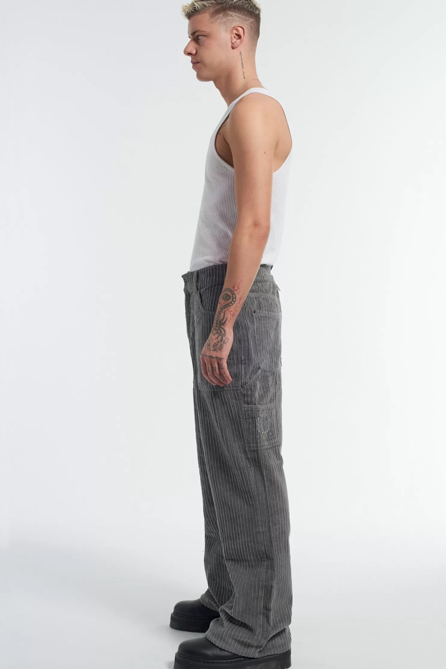 The Ragged Priest Jumbo Cord Skate Jean In Grey Corduroy With Classic “Ragged Jeans” Vegan Belt Loop Back Tab.No Stretch…