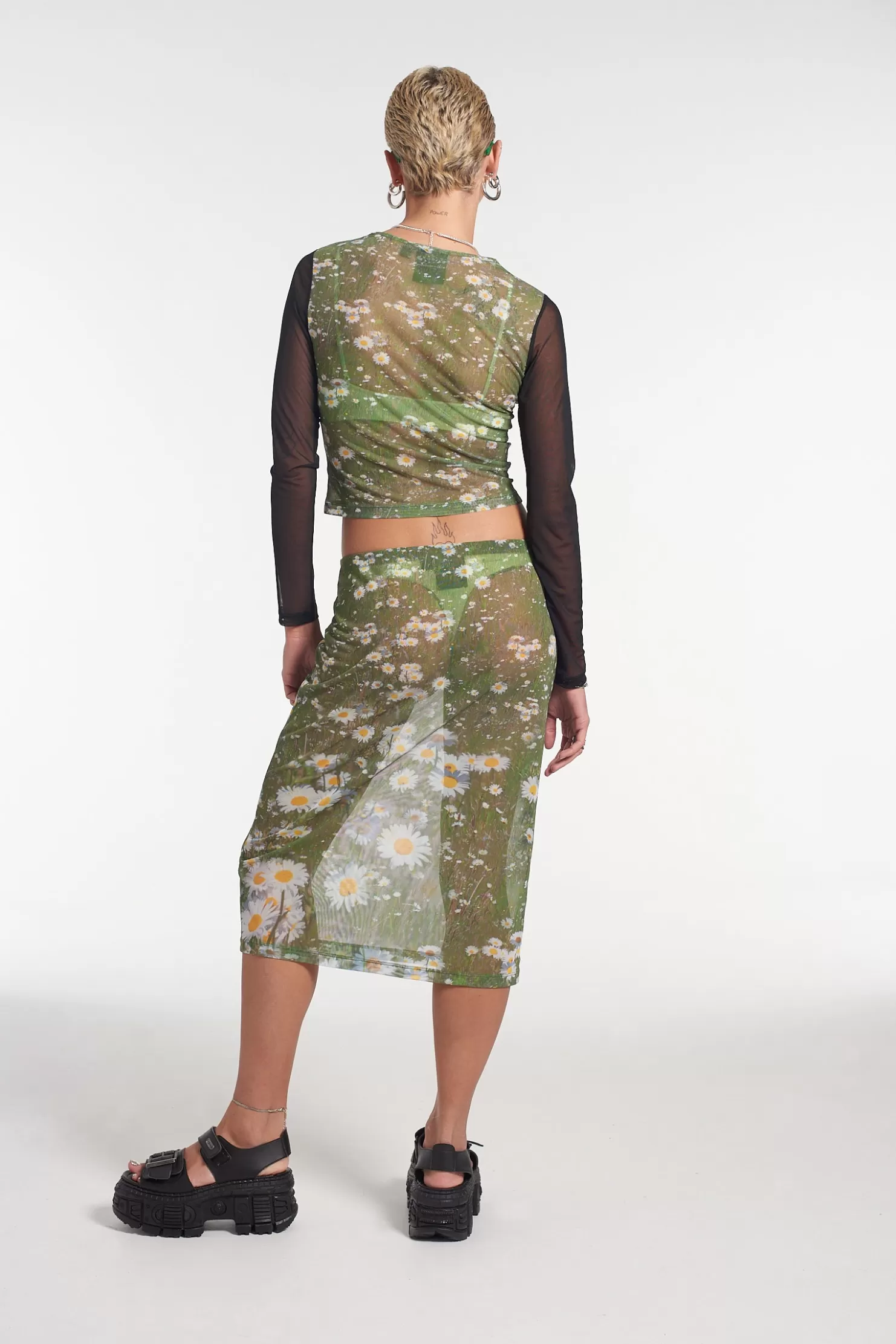 The Ragged Priest Green Mesh Midi Skirt With Realism Daisy Graphic Print. Part Of A Co-Ordmidi Length Select Your Norm…