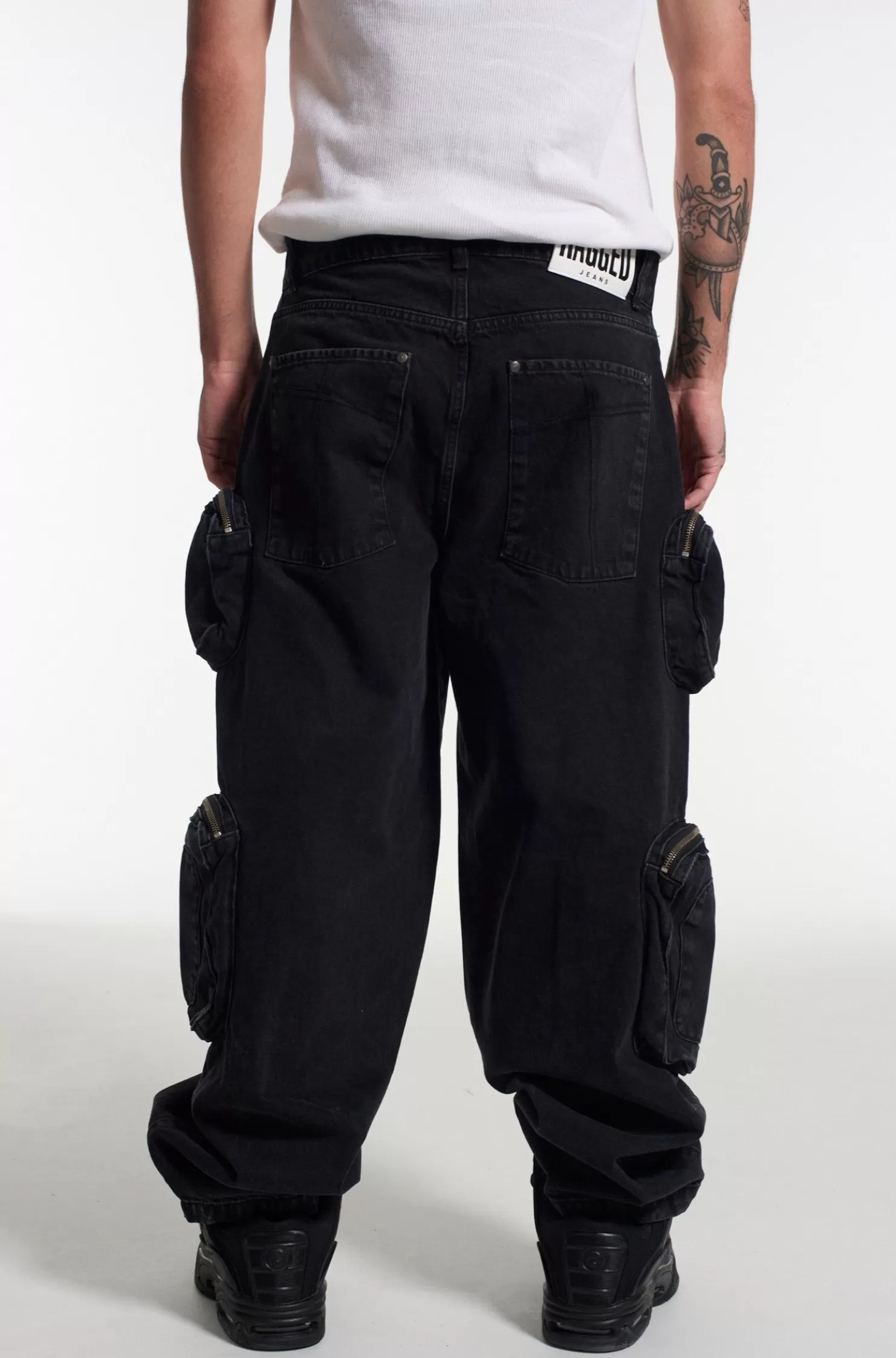 The Ragged Priest Balloon Leg Jeans In Black Denim With Combat Side Pockets. Non Stretch Rigid Denimwide Leg With Nar…