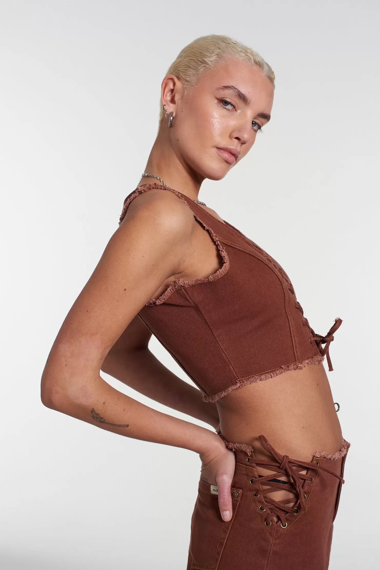 The Native Top Is Our Brown Panelled Corset Style Crop Top With Lace Up Central Fastening Detail.• Non Stretch Fabric• Cropped Length• Part Of A Co-Ord• Matching Item Available• 100% Cotton (50% Recycled) Model Is 5’10 And Wears A Uk Size 8. This Product Is Made With 100% Organic Cotton, Which Is Produced Without The Use Of Any Synthetic Pesticides And Fertilisers Or Genetically-Modified Seeds. Most Organic Cotton Is Rain-Fed, Leading To Significant Water Savings, And Organic Agricultural Practices Also Ensure That Farmers Produce More Than One Crop, Which Supplements Their Food And Income And Helps Regenerate The Soil.
