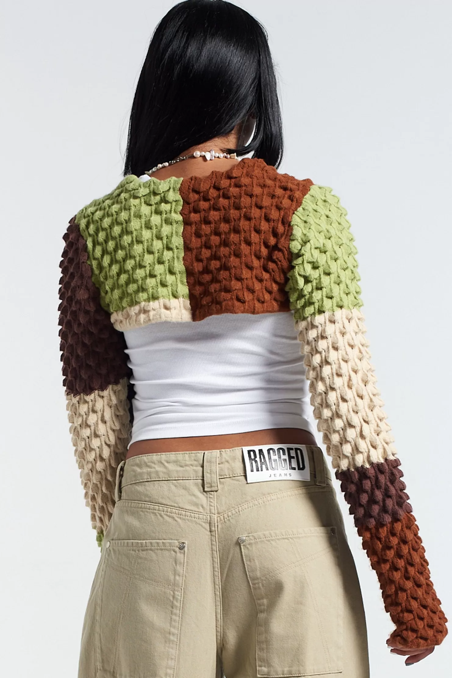 The Ragged Priest Ultra Cropped Textured Knitted Cardigan Shrug In Patchwork Colour Block. Ultra Cropped Lengthsoft Th…