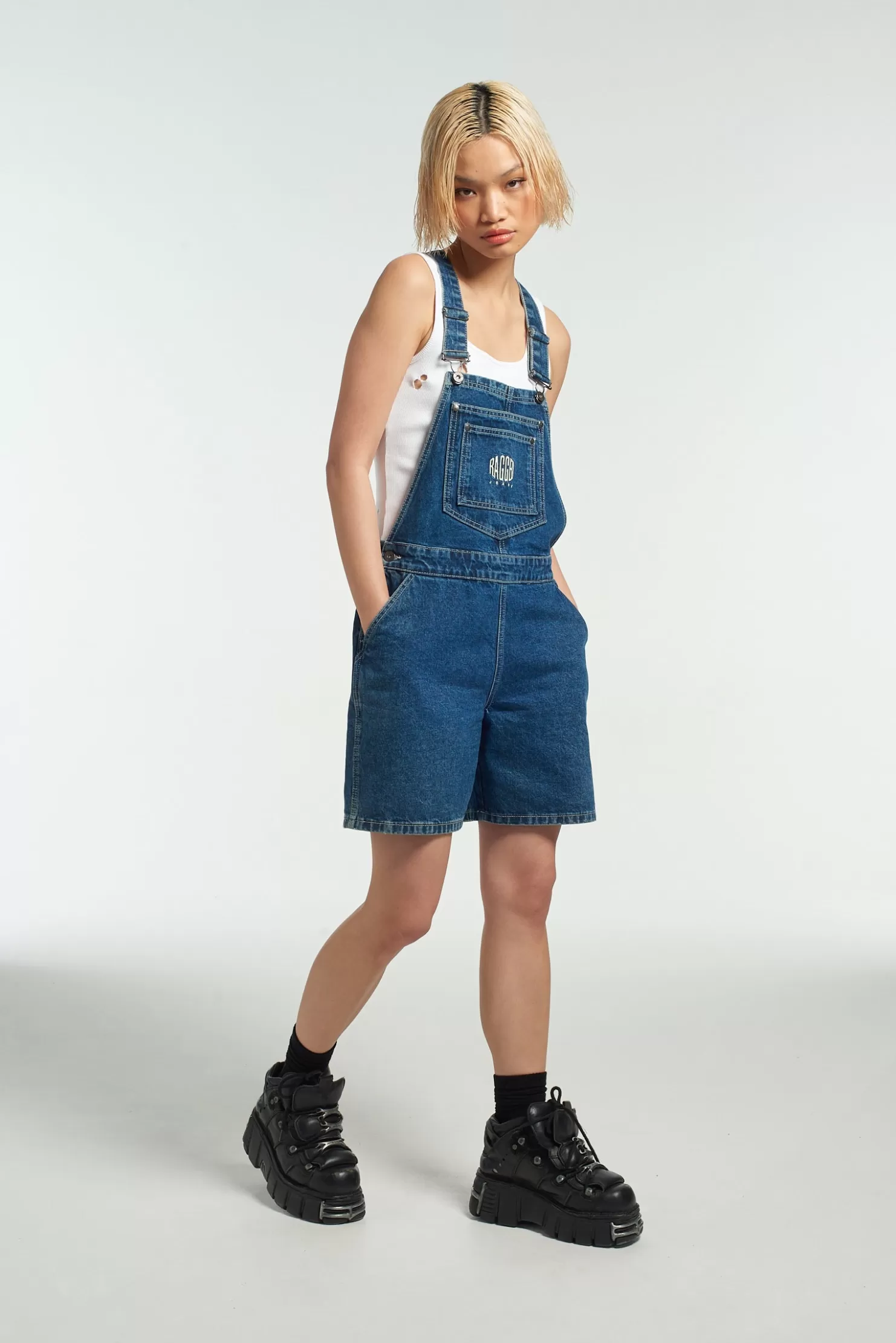 The Ragged Priest Blue Denim Overall Shorts With Central “Ragged Jeans” Embroidered Logo. Rigid Non Stretch Denimstrai…