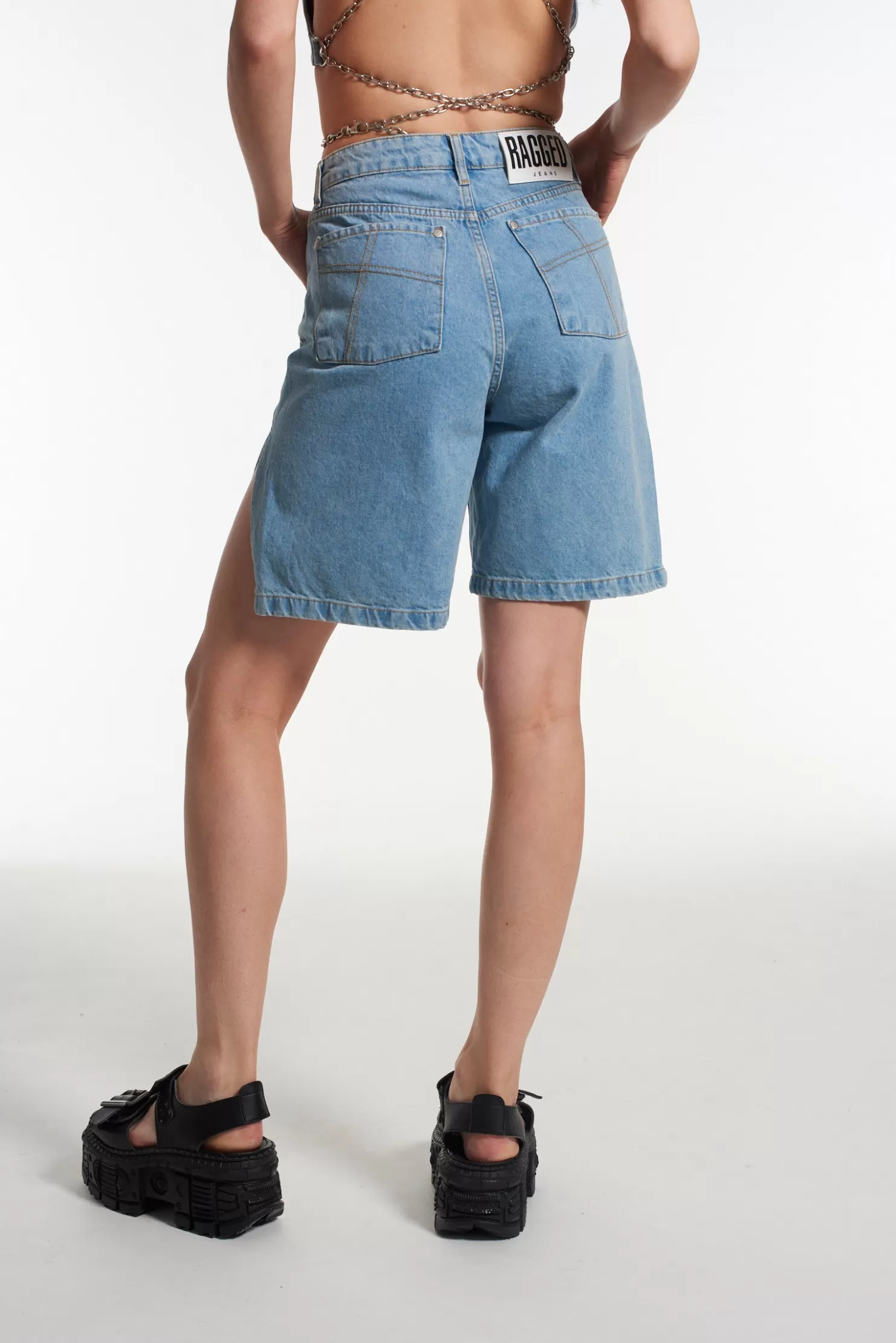 The Ragged Priest Blue Denim Knee Length Shorts With Side Split Hems. No Stretch Rigid Denimhigh Rise Split Legselec…