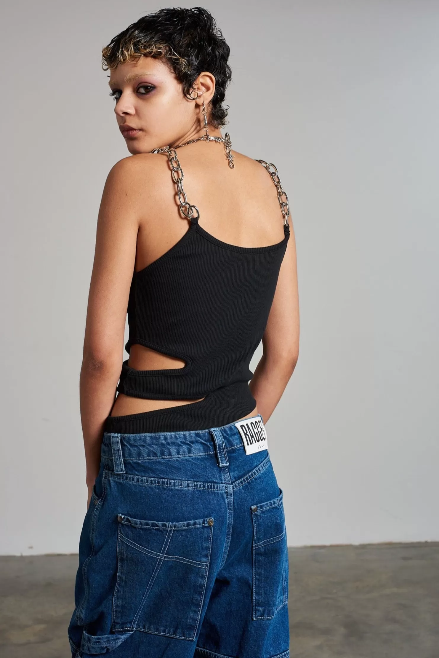 The Ragged Priest Black Ribbed Cami Top With Cut Outs And Chain Straps.97% Cotton 3% Elastane.Machine Wash Inside Out On…