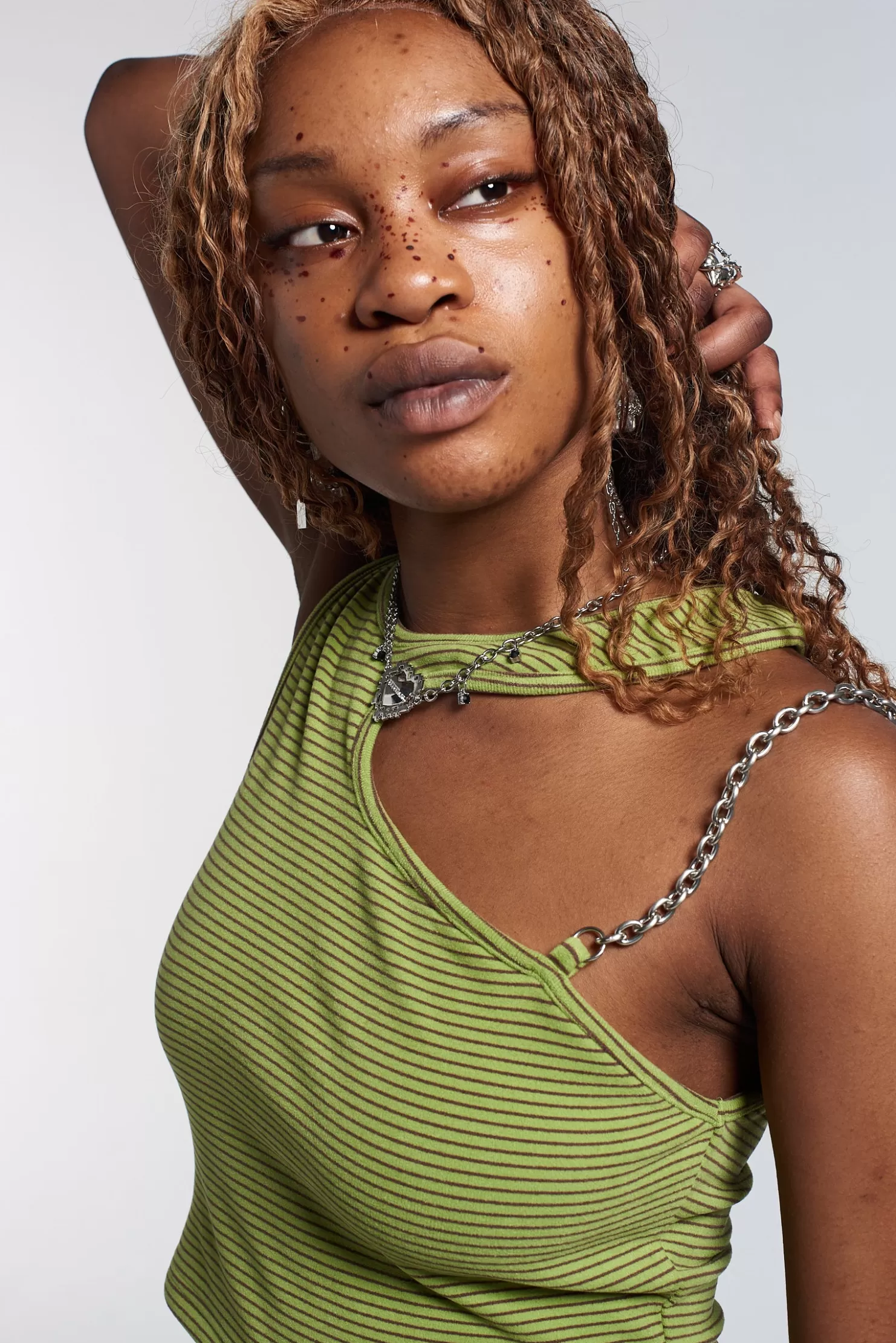 The Ragged Priest Green Stripe Crop Top With Asymmetric Cut Out And Chain Shoulder Strap. Soft Fleece Like Fabriclow S…