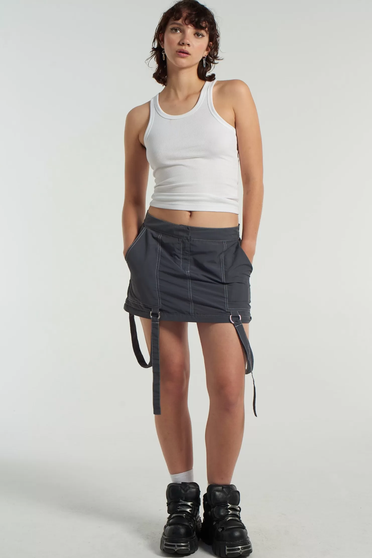 The Ragged Priest Multi Layer Charcoal Cargo Skirt With Combat Style Side Pockets, Continuous Utility Straps And Trigge…