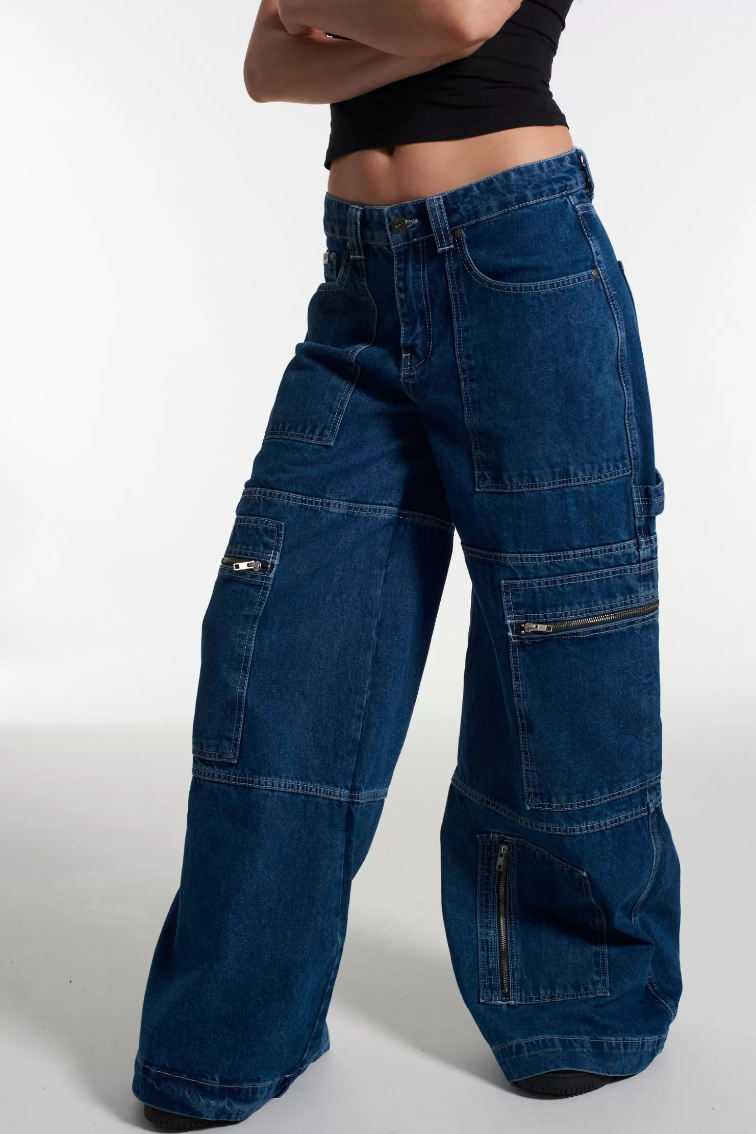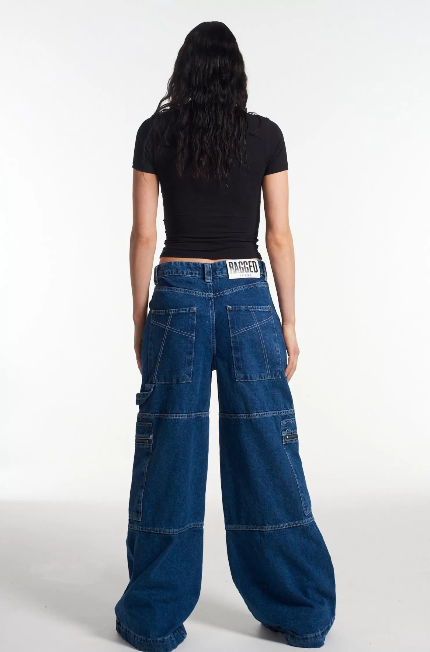 The Ragged Priest Signature Sweeper Jean Fit In Our Mid Blue Wash Organic Denim With Combat Style Pockets With Silver…
